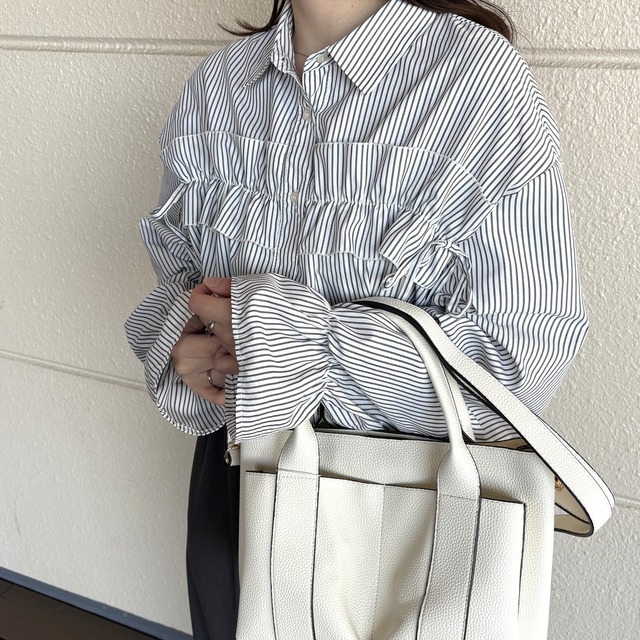 フロントのリボンデザインとふんわり広がるフリルが、 1枚で華やかな印象をつくるショート丈ブラウス. 肩に程よく落ちるゆるめのシルエットが抜け感を出しつつ、 身丈46cmのバランスでウエスト位置を高く見せられるのがポイントです. カラー:オフ×ブラックストライプ フリーサイズ 身丈46cm バスト90cm 肩幅53cm 袖丈58cm 【素材・成分】 ポリエステル80% 綿20%