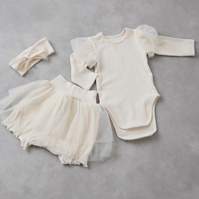 出産祝いなどのギフトにおすすめな3点セット♡ リブ素材×チュールの組み合わせが可愛らしいコーディネートSETです。 チュールのパフスリーブが可愛いロンパースと、ふわふわチュールのブルマ、同素材のヘアバンド、全て合わせて着るのはもちろん、別々にもお使いいただけます。 伸縮性があるリブ素材は体に優しくフィットし、ベビーにもストレスを与えません。 ロンパースの股にはスナップボタンがあり、オムツ替えもOK。 ハイウエスト気味のボトムスがお腹がの冷えを防いでくれます。 本体:綿95%、ポリウレタン5% 別布:ポリエステル100% 【ロンパース】 size 70cm:着丈39 身幅21 肩幅20 袖丈23 80cm:着丈43 身幅23 肩幅21 袖丈26.5 【ブルマ】 70cm:総丈24 ウエスト32 足回り1周24 80cm:総丈27 ウエスト34 足回り1周26 【ヘアバンド】 70cm:頭囲32 幅7 80cm:頭囲34 幅7 単位(cm) すべて平置きでの採寸です。 生地にたるみが出ないよう軽く張った状態で採寸しております。 生地の性質や個体差により1~2cm前後の誤差が生じる場合がございますので、あらかじめご了承ください。 riziere