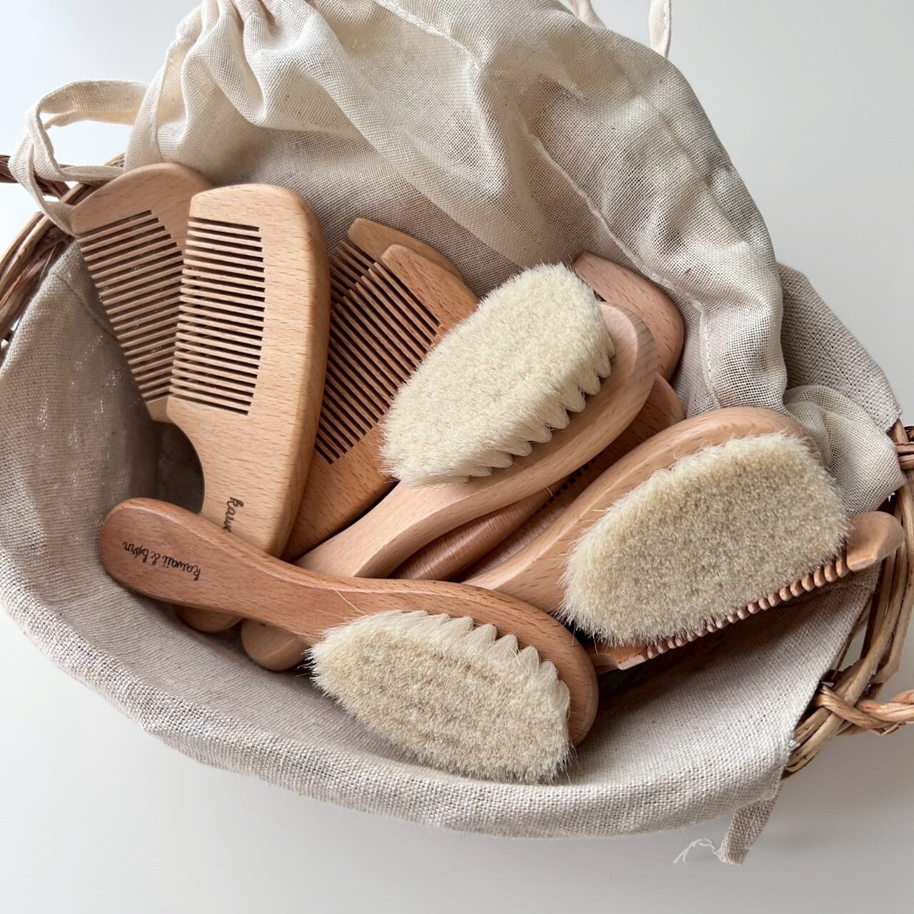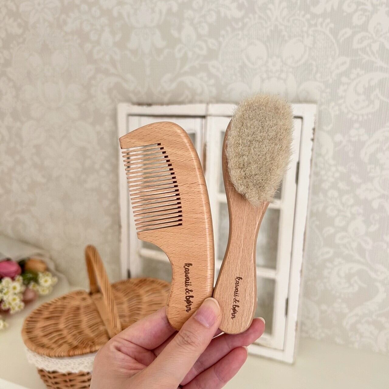 天然木とやわらか山羊毛で生まれたての赤ちゃんの髪に、やさしいブラシのセット。