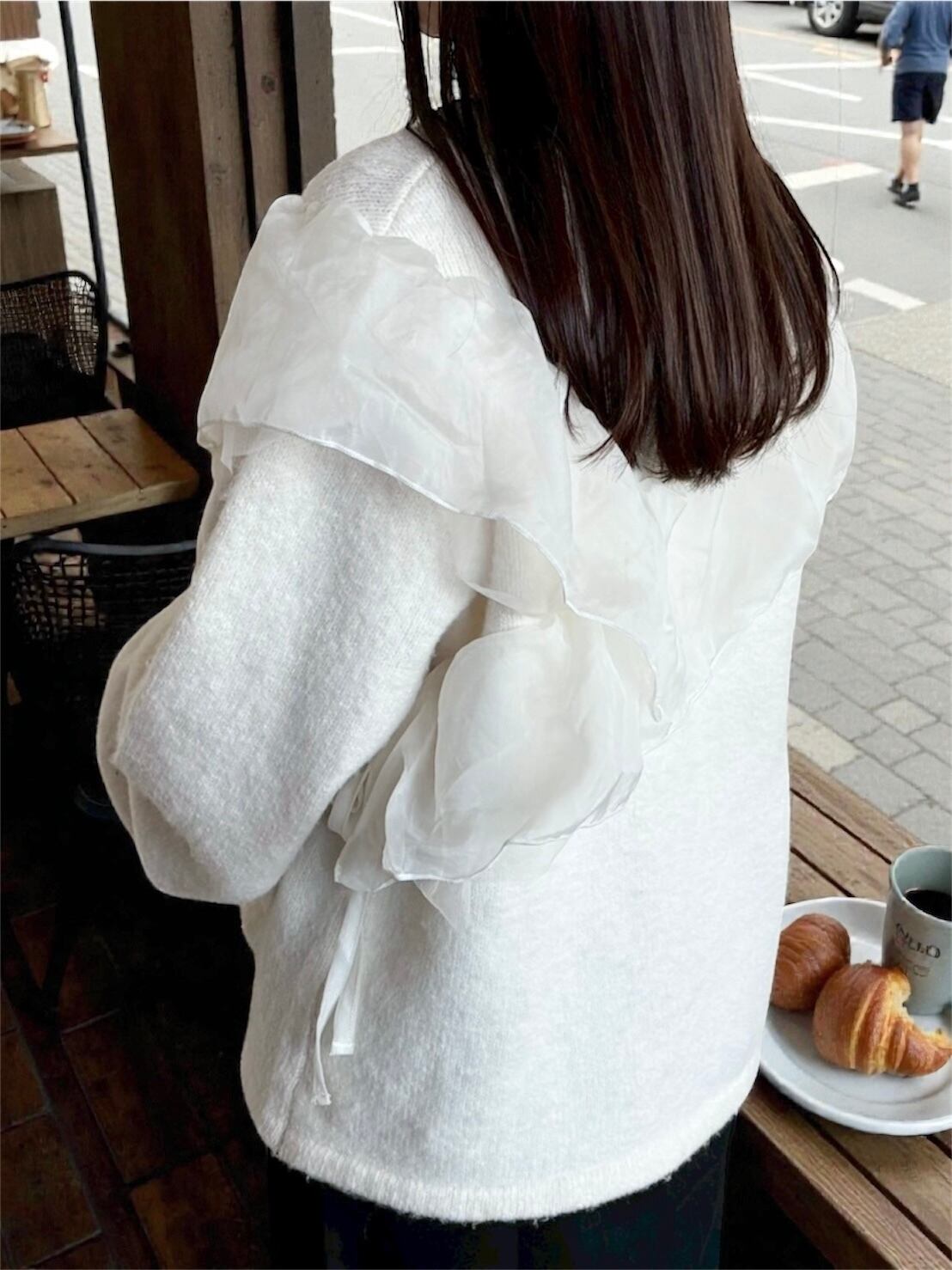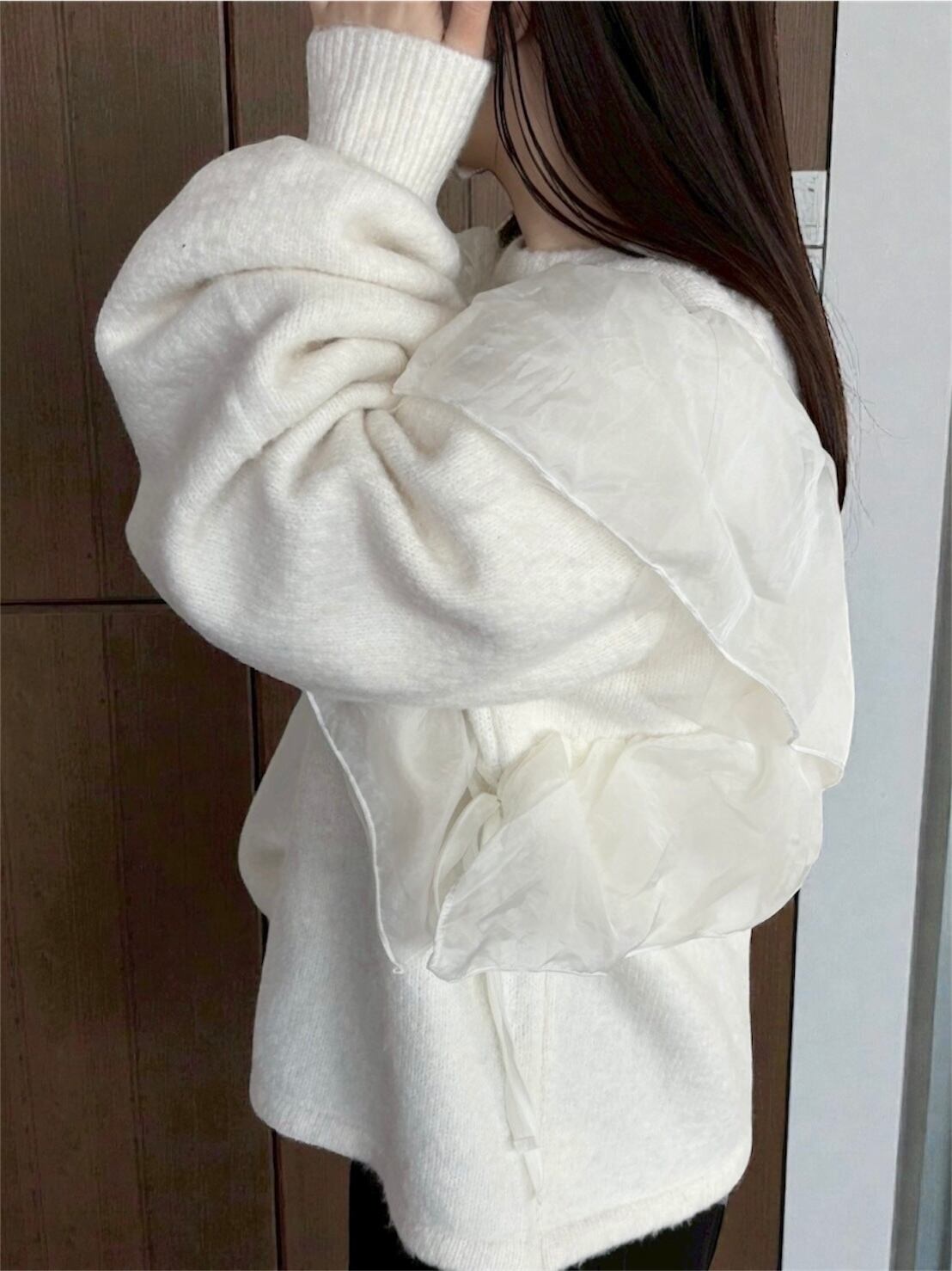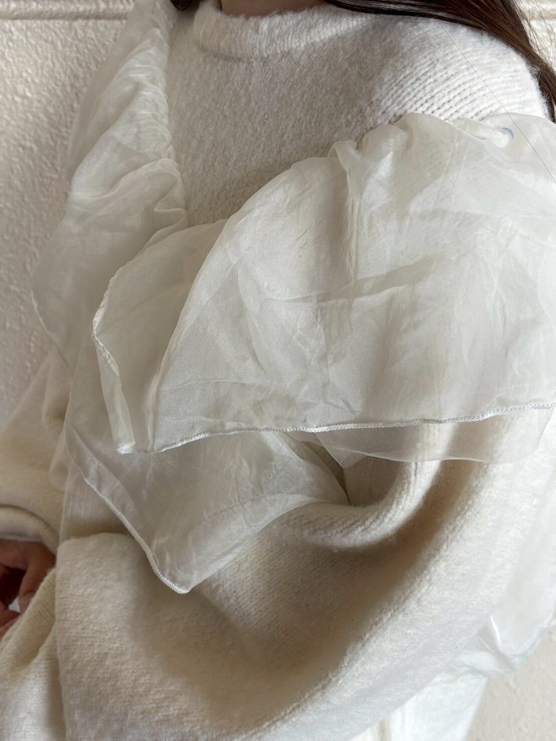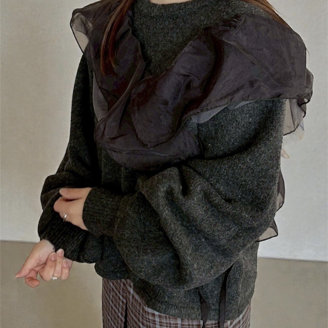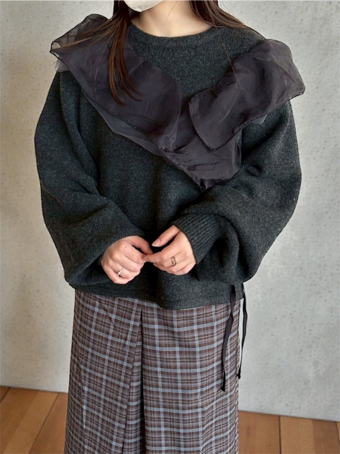 ニットの柔らかい素材の上に、チュールを被せ、さらにその上からオーガンジーのフリルが付いた優しい印象です。
