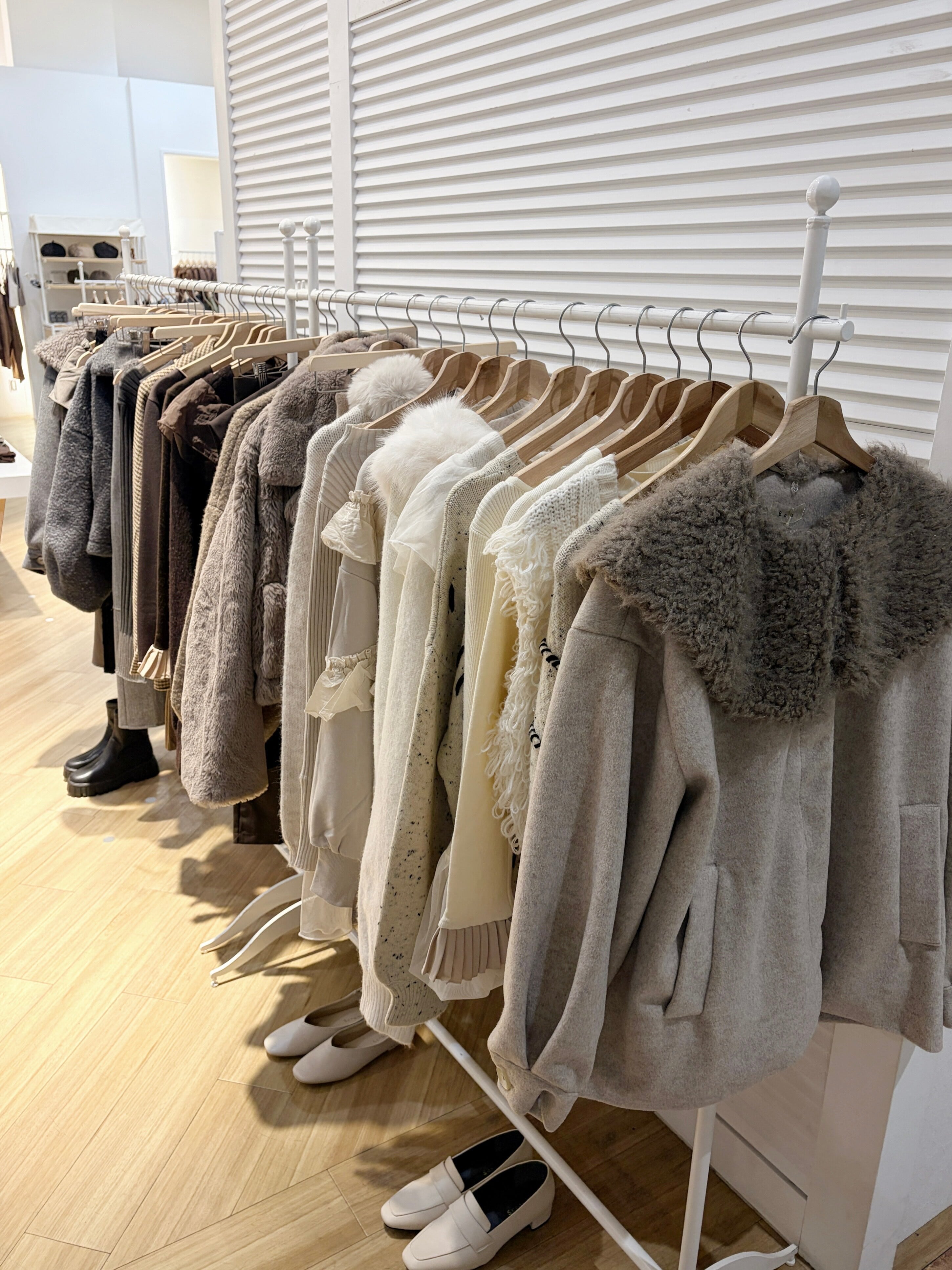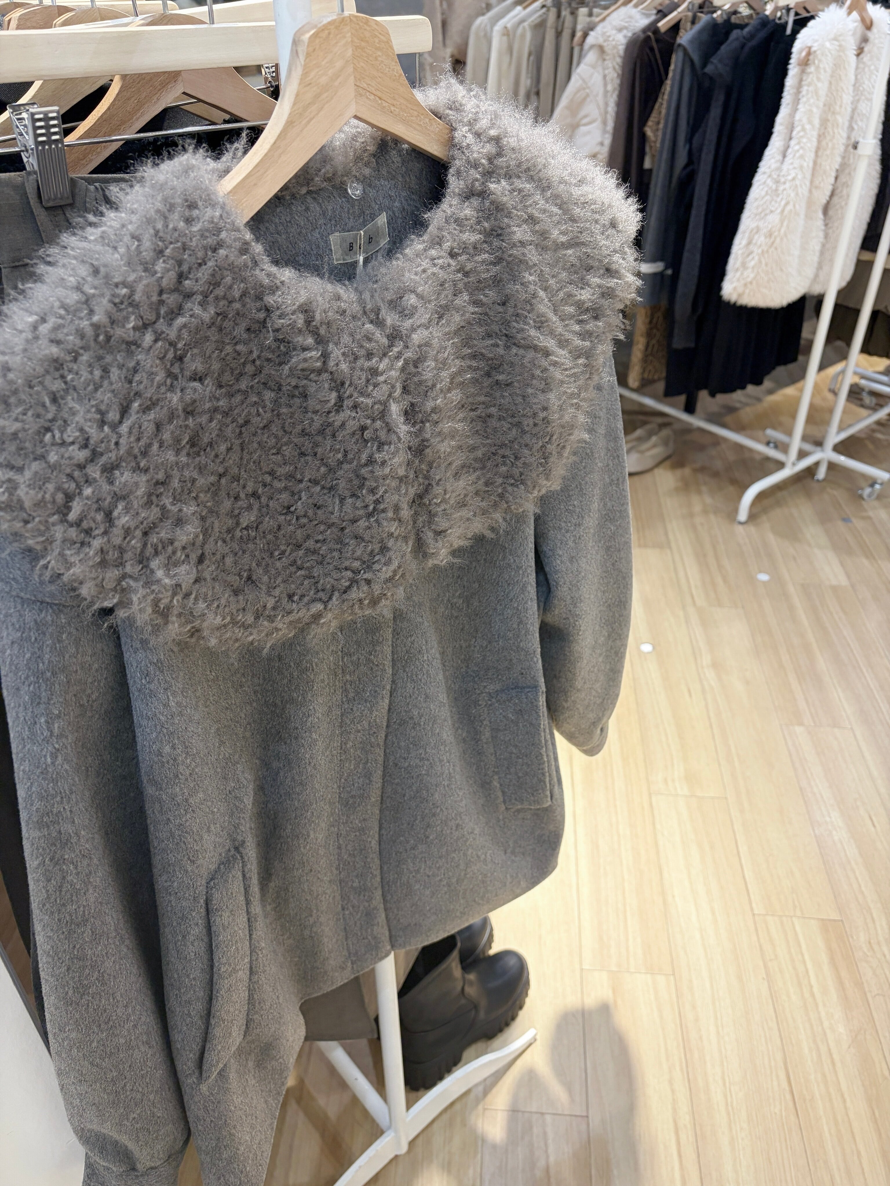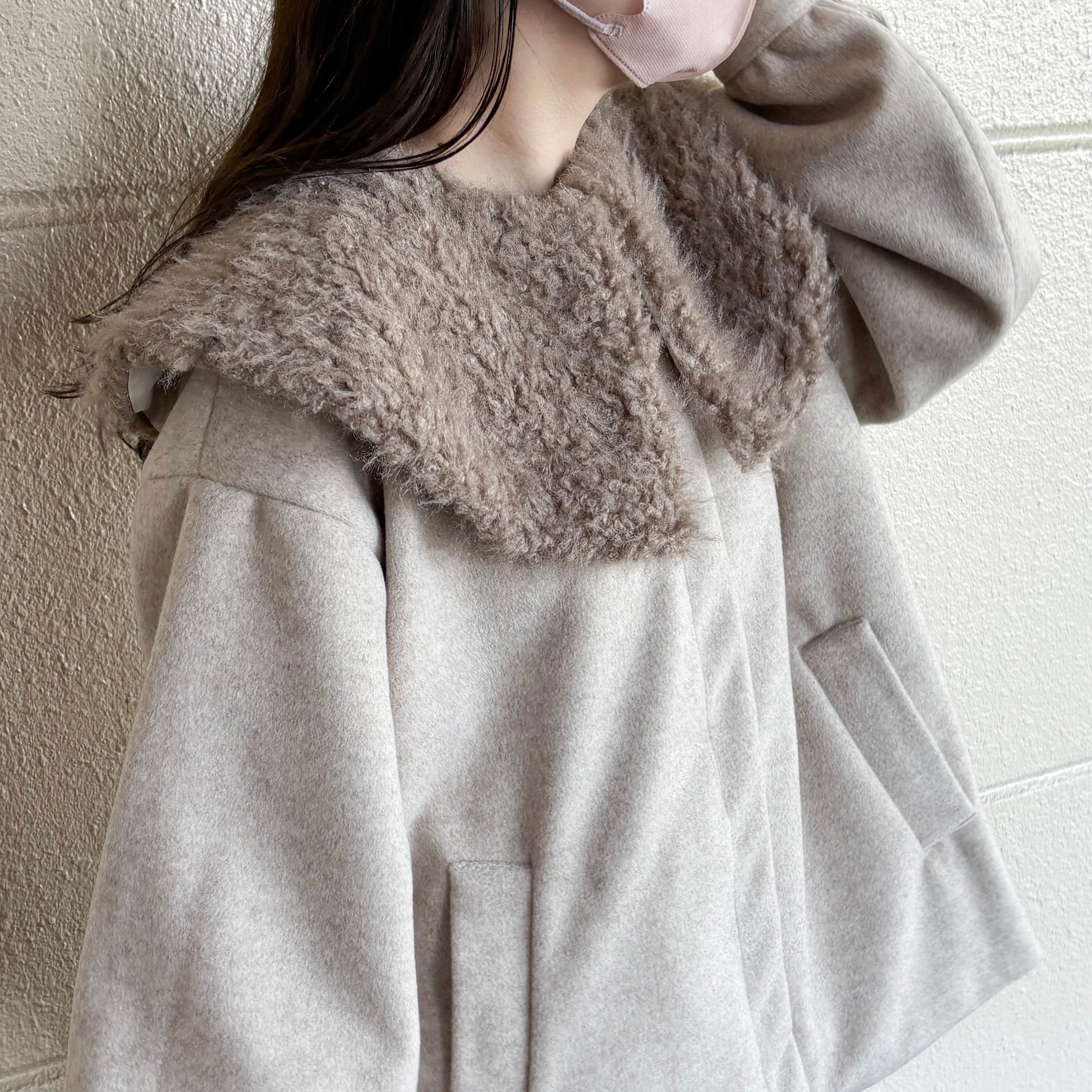 丸みのあるビッグカラーが顔まわりをやさしく包み、