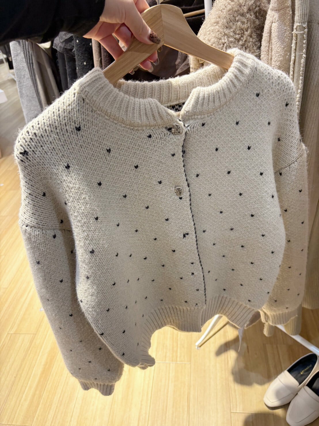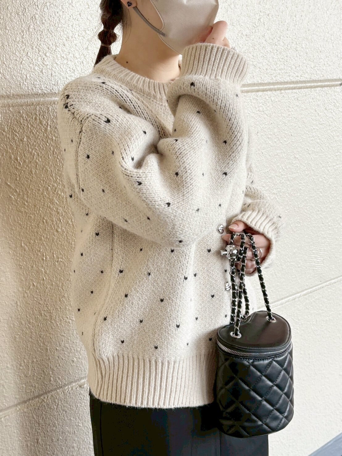 ドットのようなハート柄編みが目を惹く、シーズンムード高まるニットカーディガン。