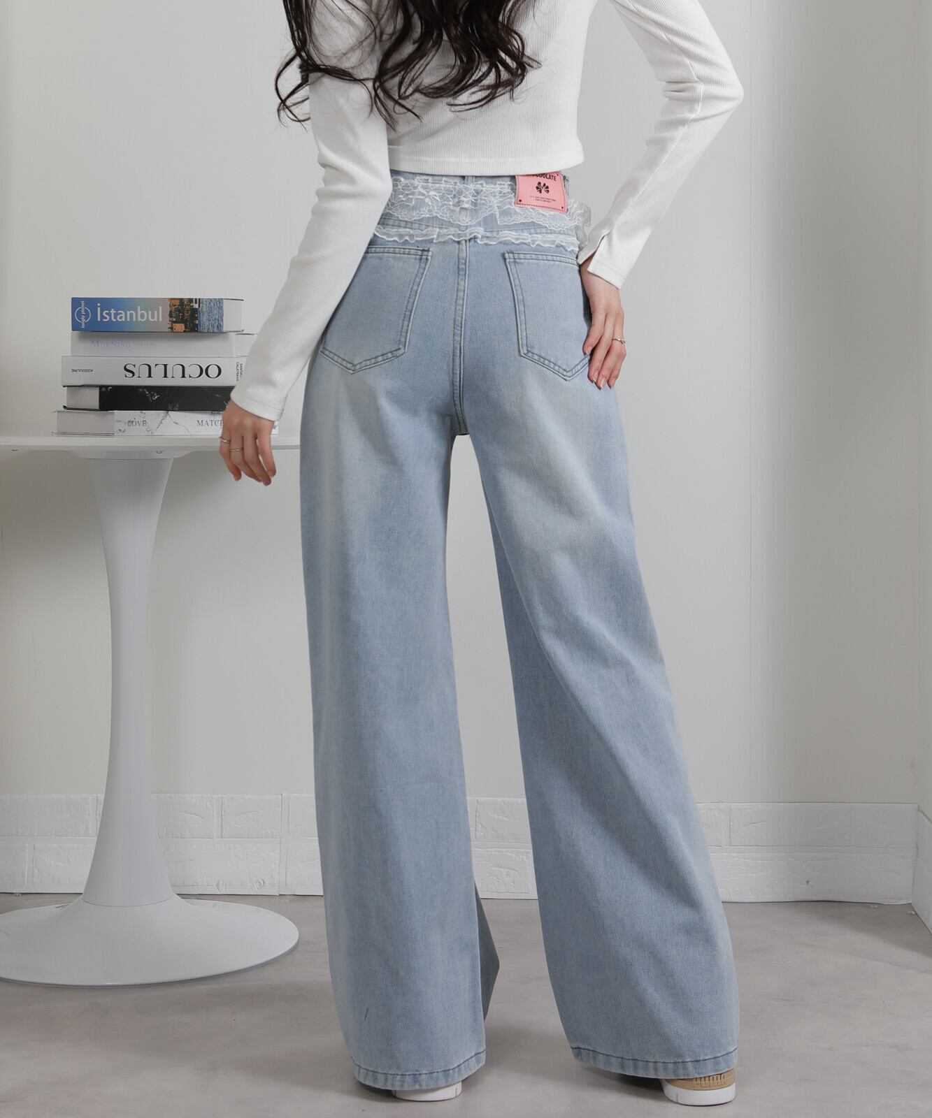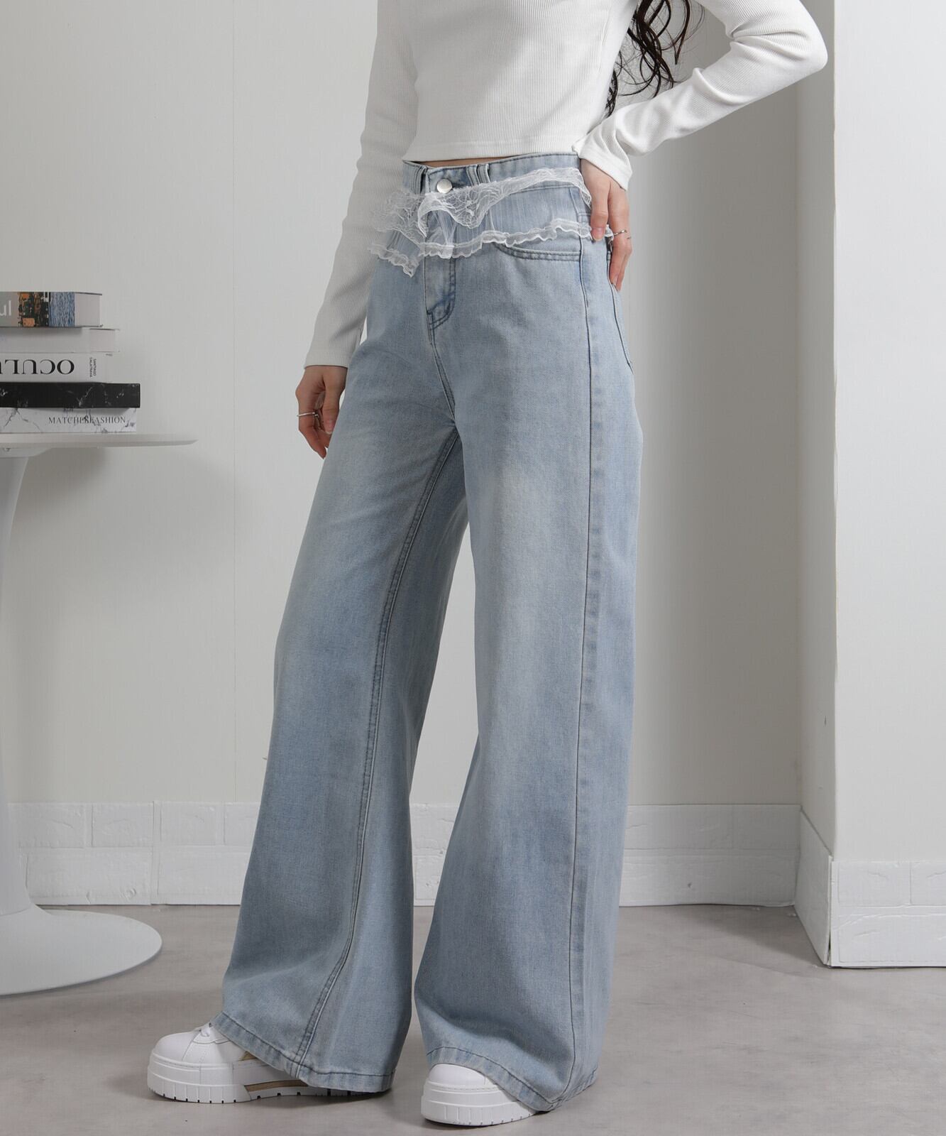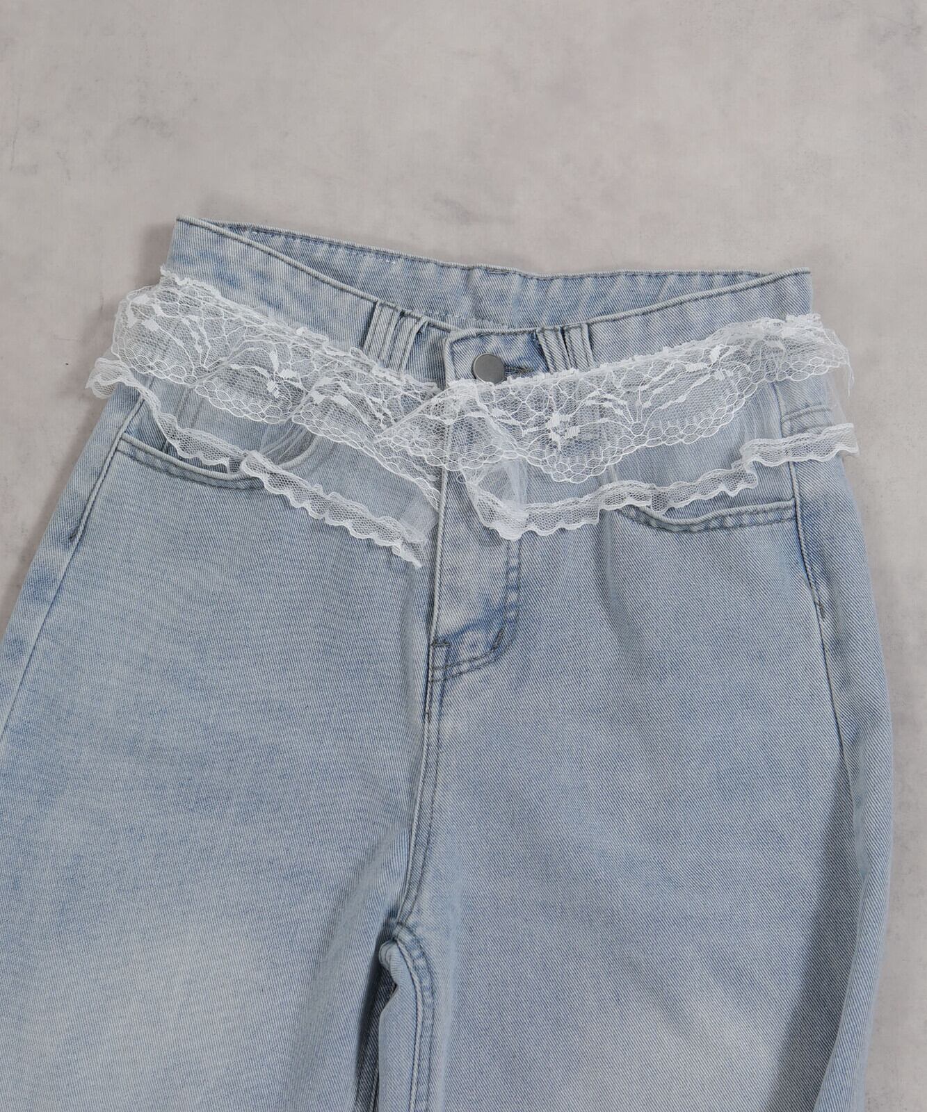 ウエスト部分のレースデザインがガーリーでかわいらしいデニムパンツ。