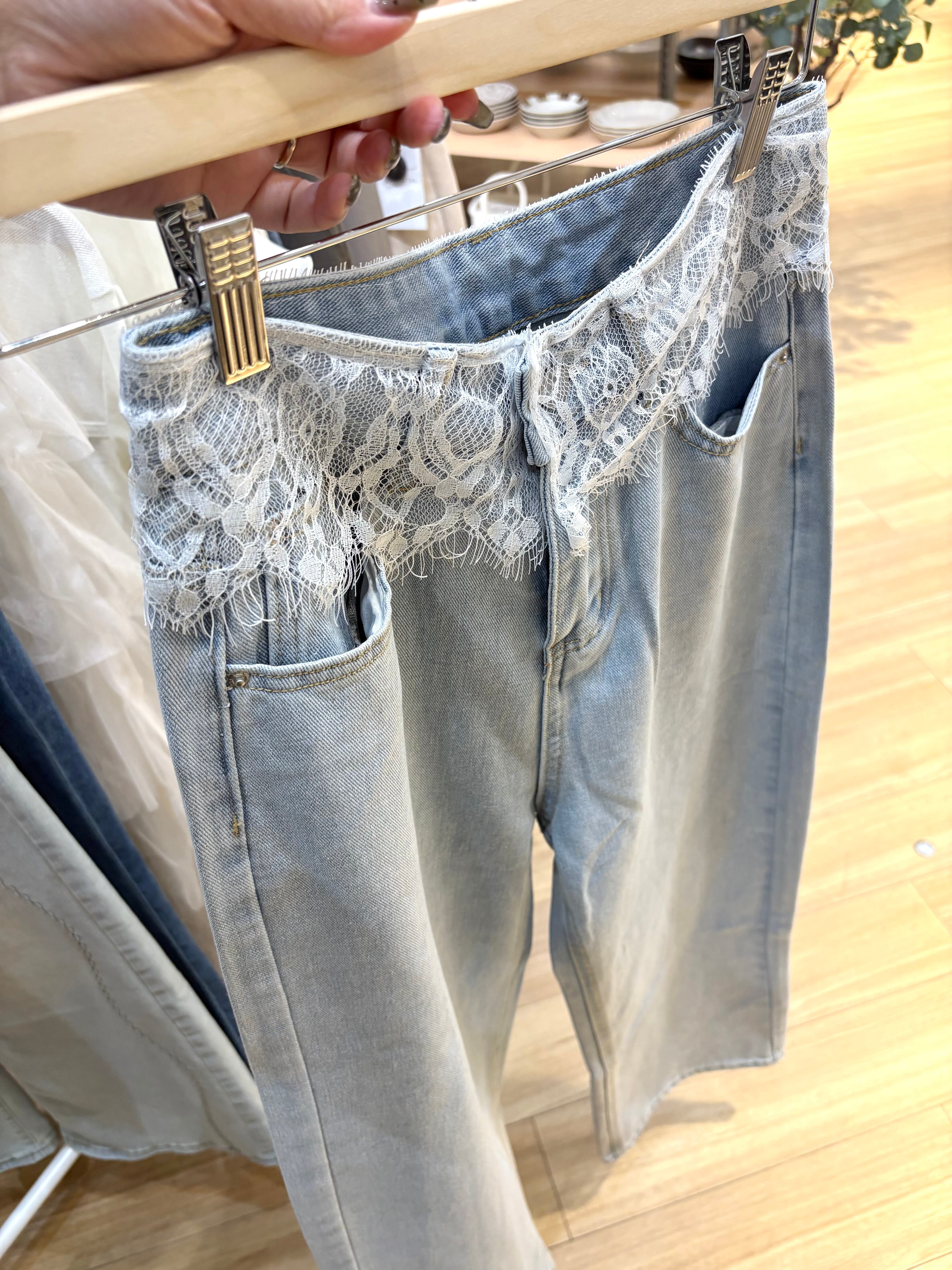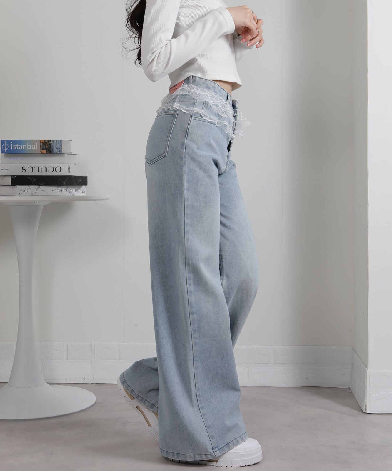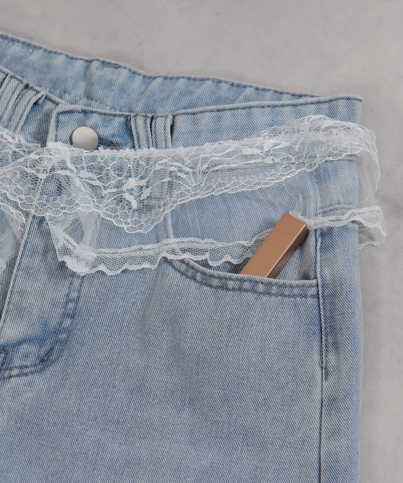 ウエスト部分のレースデザインがガーリーでかわいらしいデニムパンツ。