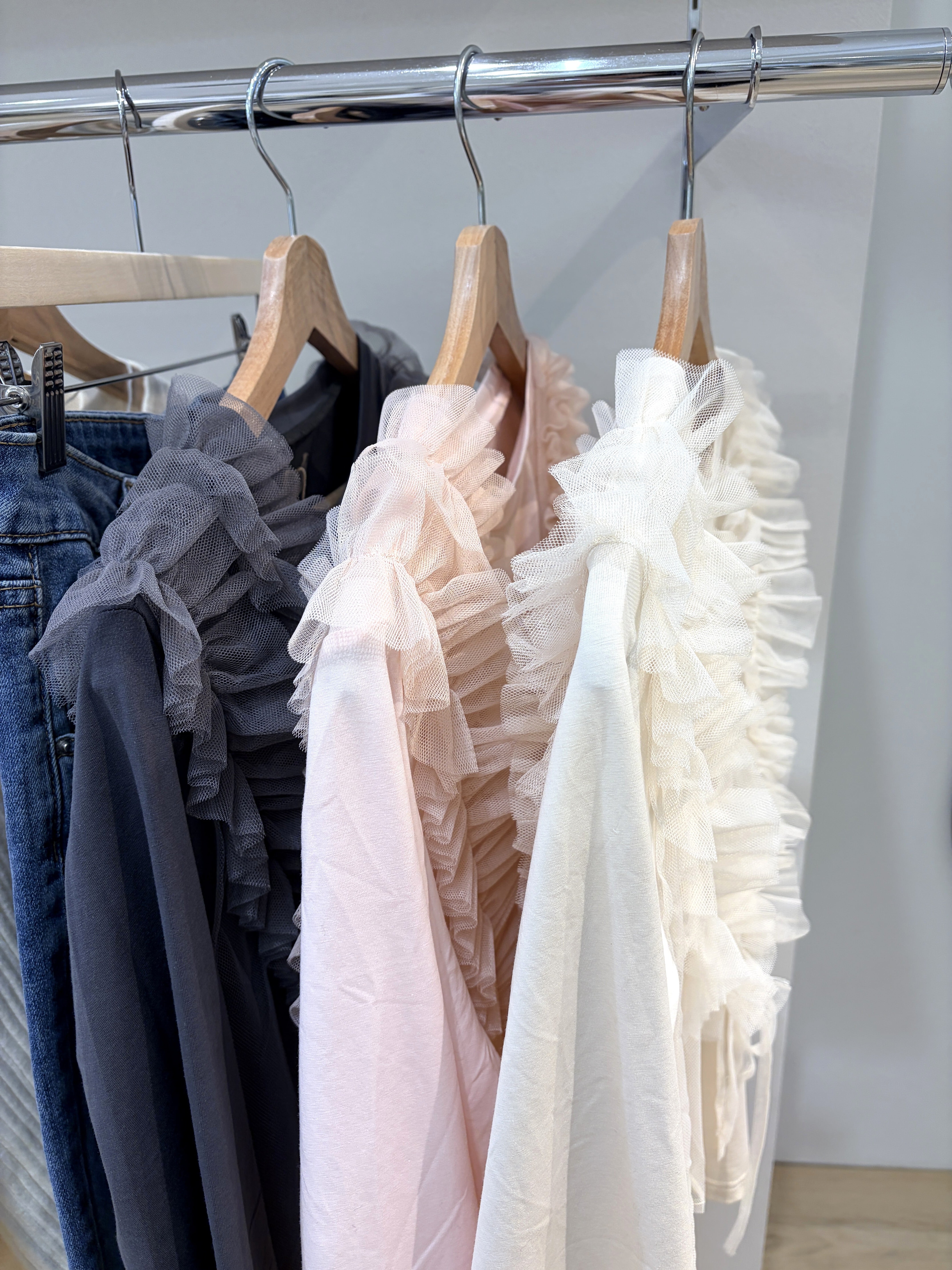 繊細なチュールフリルが目を惹く、前後2WAY仕様のベストと